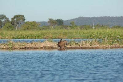 Finalmente il tempo si è rimesso al bello e il caldo, per fortuna, non è ancora tornato. Così abbiamo deciso di dare um passeio nel Pantanal. O piloteiro profissional sa dove andare, inizialmente ci guarda con sospetto, poi ci invita a salire sulla sua lancia a quattro posti, ci aiuta ad indossare il giubbotto salvagente arancione, scavalca tutti e si posiziona sul suo trapuntino accanto al motore. Iniziamo la navigazione costeggiando la riva destra del fiume in direzione della foce che si trova a svariate migliaia di chilometri da dove ci troviamo noi. Dopo averci lasciato alle spalle una base della Marina militare brasiliana di stanza a Ladário, un piccolo comune vicino a Corumbá, iniziamo ad immergerci nella natura. A perdita d'occhio c'è solo l'acqua del fiume e la vegetazione. Sappiamo che li vicino ci sono anche piragna, anaconde e caimani. Ma questi hanno paura dell'uomo e del rumore assordante che il motore provoca nell'acqua. Per ora vediamo solo uccelli multicolori appollaiati sui rami degli alberi.